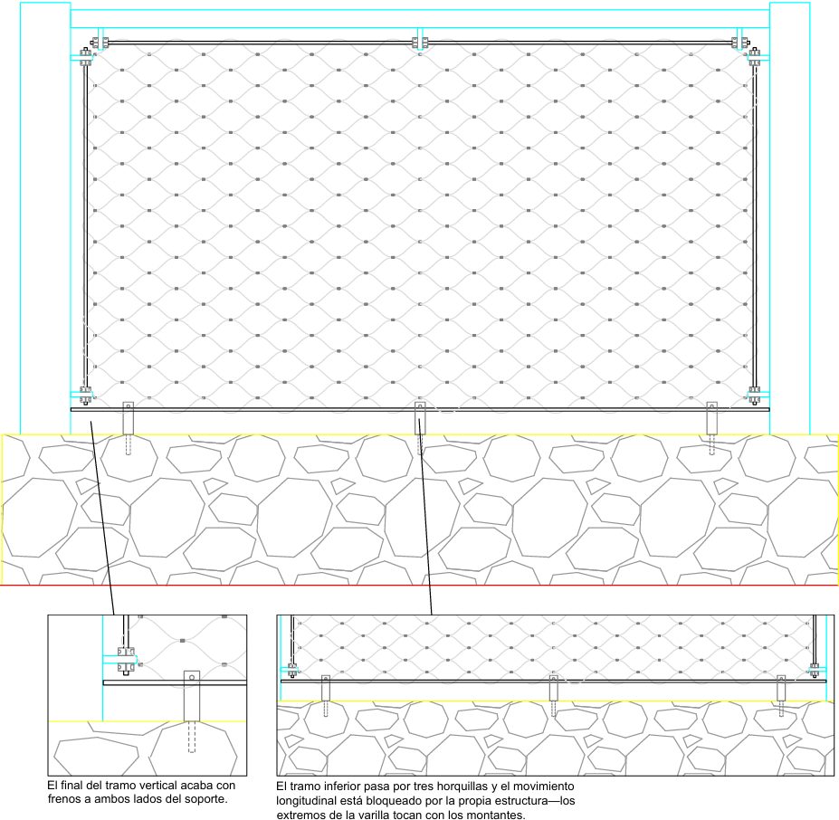 Utilizamos varillas redondas de acero inoxidable AISI 316 como elemento principal para crear el marco de soporte donde se monta el panel de malla correspondiente. La varilla se fija a la estructura mediante soportes separados entre 50 y 90 centímetros, en función del diámetro de la varilla.