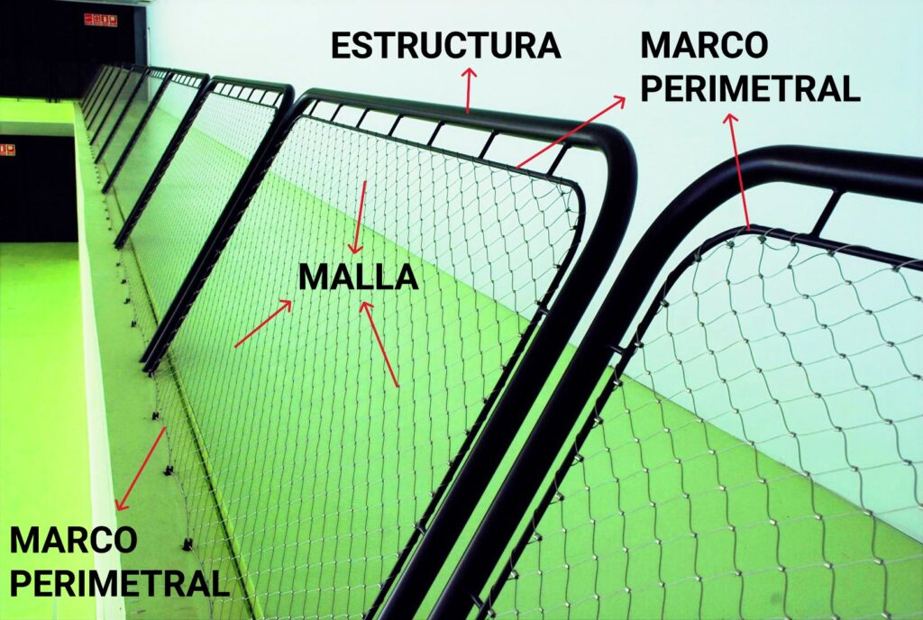 - Marco perimetral: el cable o perfil que recorre todo el exterior del panel y sirve para que la malla quede tensada.